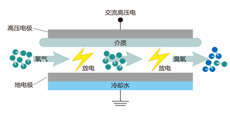 工业上一般采用电晕放电法制取。其原理为:当氧气通过对高压交流电极之间的放电电场时,在高速电子流的轰击下将氧分子离解为氧原子,氧原子迅速与氧分子反应生成臭氧分子。如下图所示: