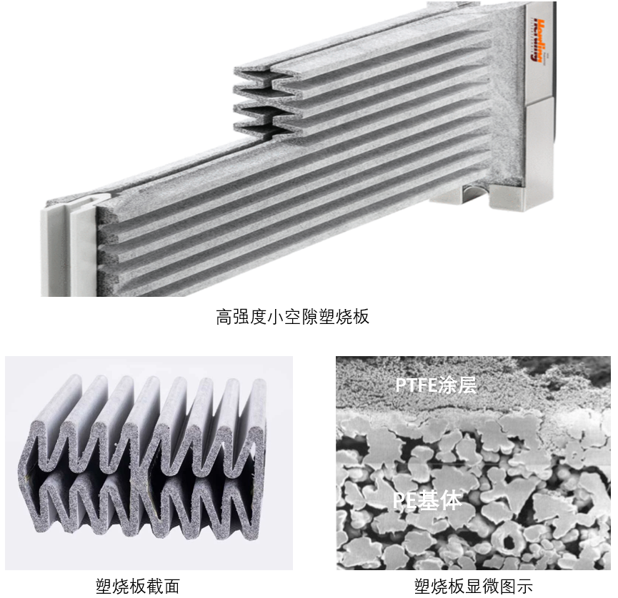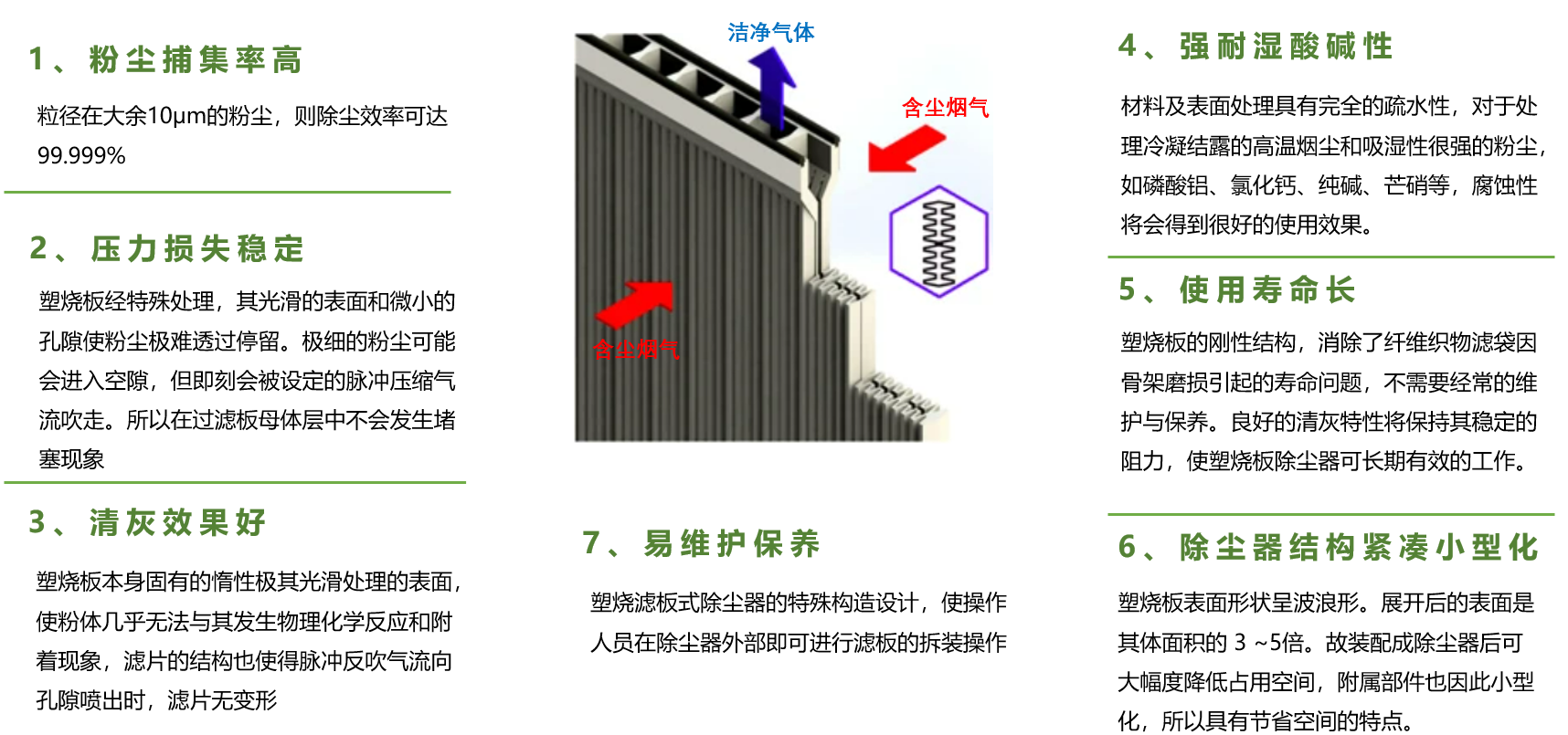 独特的波浪式塑烧板过滤芯取代传统布袋,由于塑烧板是刚性结构,不会变形,又无骨架磨损,所以使用寿命长,在有些工况条件下,它的使用寿命是布袋的 10 倍以上。由于塑烧板表面经过深度处理,孔径细小均匀,具有疏水性,不易粘附含水量较高的粉尘,所以在处理含水量较高及纤维性粉尘时塑烧板除尘器是最佳选择。还可以处理超细粉尘和高浓度粉尘,布袋收尘器的入口浓度一般小于 20 g/m3,而塑烧板除尘器入口浓可达500 g/m3,可简化二级收尘为一级收尘。