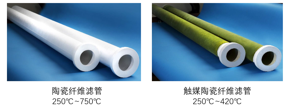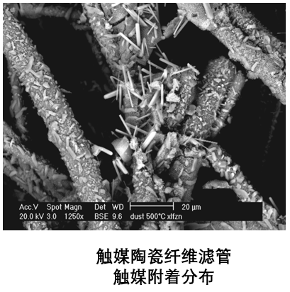 触媒陶瓷纤维滤管以基管作为基材,通过将纳米级SCR催化活性组分以特定的形式均匀涂覆于整支滤管之上,形成表面除尘、管壁内部脱硝的双效复合能力。