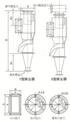 XLP型除尘器根据安装在风机前后位置的不同分为X型(吸出式)和Y型(压入式),其中X型是在除尘器本体上增加了出口蜗壳。X型、Y型根据蜗壳旋转方向不同又分为N型 (左回旋)和S型(右回旋)。