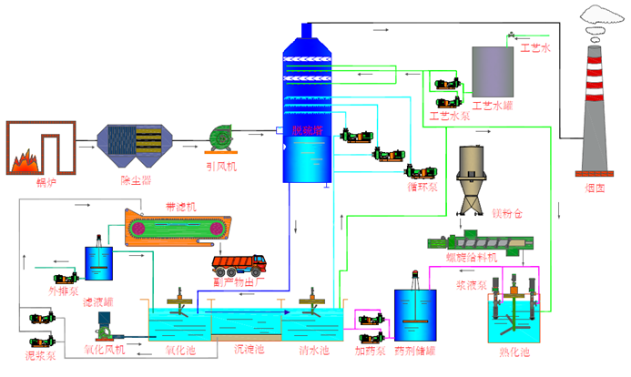 氧化镁法脱硫工艺是指以氧化镁为原料,与水混合制成氢氧化镁悬浊液送至脱硫塔中与烟气中的SO2反应生成亚硫酸镁,如亚硫酸镁进一步氧化,可生成硫酸镁的脱硫技术。